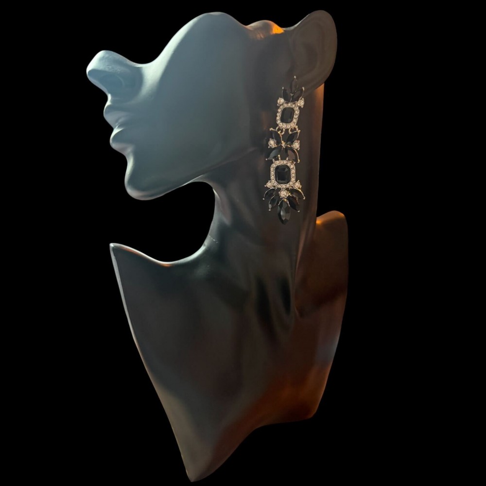 Boucles d'oreille en strass AB noirs- monté sur acier argenté. brillance extrême et raffinement pour ces boucles de 8 cm de longueur. Très légère.